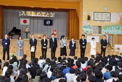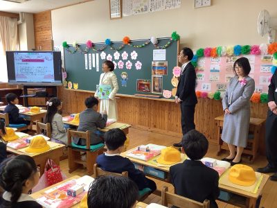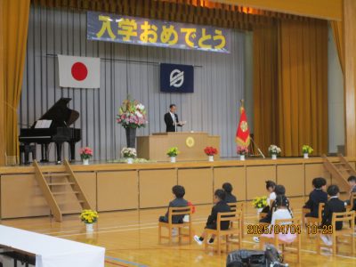 10:25~入学式をしました。「新入生呼名」では,一人一人が元気よく返事をしていました。「学校長式辞」で,作地校長は「ごはんをしっかり食べよう。挨拶をしっかりしよう。自分の大好きなことを見つけよう。」と,1年生に話をしました。