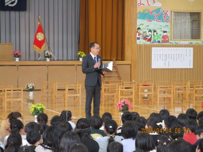 始業式で,作地校長は,「挨拶ができる子・当たり前のことがしっかりできる子になってほしい。」と,2~6年生の児童に話をしました。