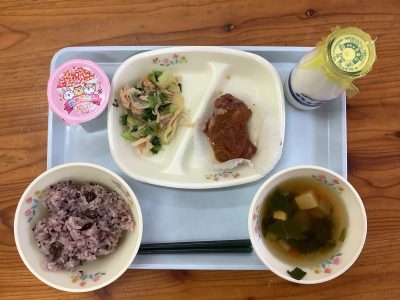 今日の給食は,「2年生以上は進級お祝い給食,1年生は入学おめでとう給食」で,主な献立は,「お赤飯と韮小ステーキ」でした。