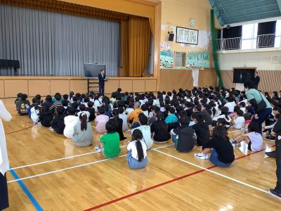 本日(5/7)8:35~今年度初めてのしずく集会(全校集会)をしました。最初に,作地校長は,「新年度が始まってから1ヶ月,みなさん,元気よく登校していてよいです。自分から進んで,まわりの人が笑顔になる挨拶をしましょう。」と,全校児童に向けて,話をしました。
