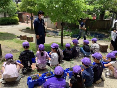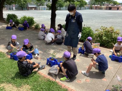 2年生は,ミニトマトの苗を植えました。1年生は,給食試食会と親子レクをしました。
