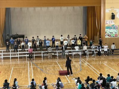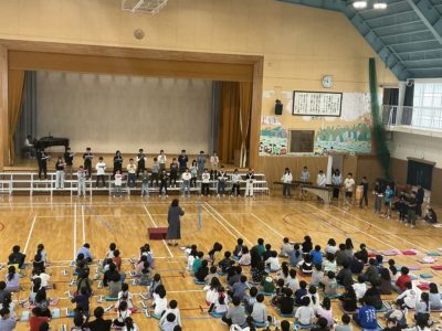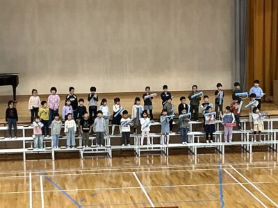 2025年10月24日 / 最終更新日時 : 2025年10月24日 niraes ブログ 音楽集会をしました。 本日(10/24)の3・4校時に,「楽しく気持ちをこめてえんそうして,思い出にのこる音楽集会にしよう!」をめあてとして,音楽集会をしました。3年生は「アチャパチャノチャ」ほか2曲,4年生は「茶色のこびん」ほか1曲,1年生は「ぶんぶんぶん」ほか2曲,2年生は「かっこう」ほか2曲,5年生は「ビリーブ」ほか1曲,6年生は「ペガサス」ほか1曲を発表しました。最後に全校で「気球に乗ってどこまでも」を歌いました。画像は,1・5・6年生の発表です。