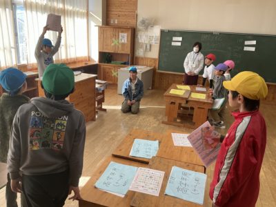本日(11/14)の1・2校時に,「しずく祭り」をしました。この祭りは,「たてわり班内の交流を深め,楽しい時間を過ごす。」を主な目的に,たてわり班ごと,6年生が考えたお店をまわり,そこでのゲームなどをして楽しむ活動です。的当てゲーム・お化け屋敷・問題を解いて暗号を探すゲームなど,全10カ所のお店があり,全校児童は,前半(店番)と後半(お店を回る)に分かれて楽しい一時を過ごしました。