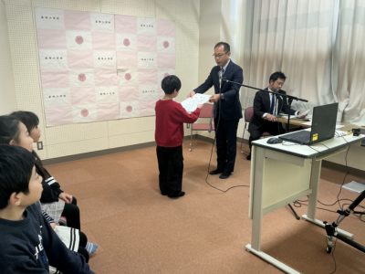 本日(12/19)に,各教室(オンライン)で,2学期の終業式をしました。式の中で,作地校長は全校児童に向けて「長かった2学期ですが,皆さんはいろいろな活動をがんばりましたね。冬休みは,年末・年始に,この時期にしかできない行事がありますので,たくさん体験してください。『自分の命は自分で守る。』として,元気に3学期を迎えてください。」と話をしました。次に,児童の代表3名が「2学期の反省と冬休みに向けて」という題で,作文発表しました。それから,先日行われた児童会役員選挙で当選した児童会長・副会長に当選証書を渡しました。(3つ目の画像は,当選証書をいただいてあいさつする新児童会長です。)最後に,これまでに取り組んだ応募課題の優秀者全員を紹介し,代表児童に賞状を渡しました。この後学級活動を行い,担任の先生から「あゆみ」をいただいたり,冬休みの過ごし方や課題等の確認をしたりしました。3学期の始業式は,1/9(金)を予定しています。